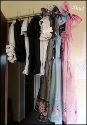 So I began working on Monday - just a few days ago. And I pretty much got everything finished that I wanted to! Every day this week I got up hours earlier than usual, and really worked at hyper speed - I spent about 15 hours each day just sewing. Monday I got two JSKs finished. Tuesday I got one JSK, two blouses, and a pair of bloomers finished. Wednesday I got one blouse, two cutsews, a pair of bloomers, and a head bow finished. And today was spent finishing up head bows, sewing on buttons, etc. (And yes, I still need to pack/figure out what I'm even wearing/finish pants for the bf, etc.) Since I don't ever make this much clothing at a time, I just had to take photos! It kinda felt like I'd made a mini wardrobe for someone :3 (Which, omg, would be amazing to do! <3)